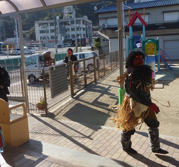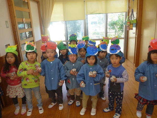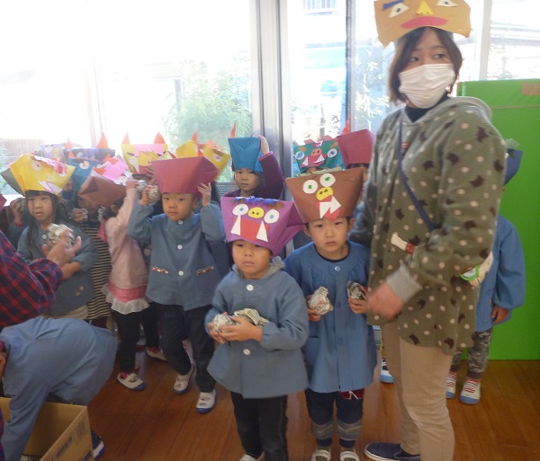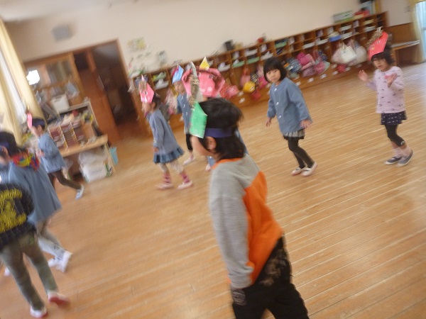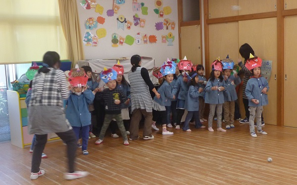 子どもたちは自分たちで作った新聞紙製の豆を一所懸命に投げて(もしくは逃げて)いました(ノД`)・゜・。
