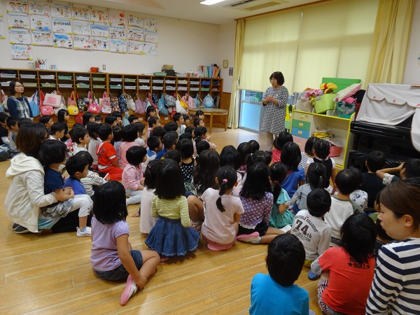 訓練後は、くま組に集まって防犯についてのお話を聞きました。