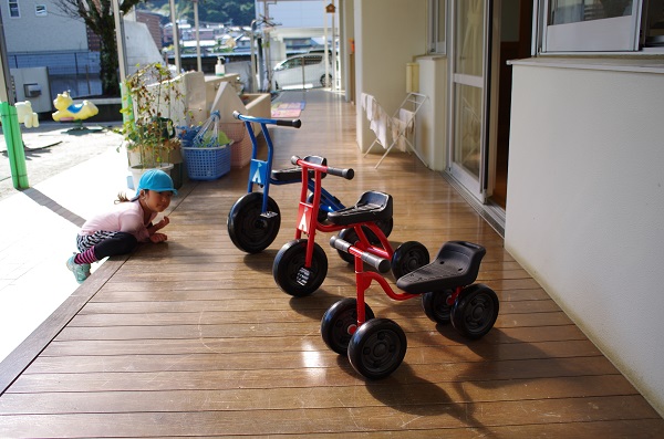 テラスにいた幼児組の子どもへお菓子やおもちゃを持って誘惑する不審者。