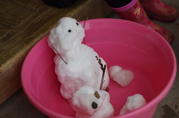 保護者の方の車の上に積もった雪をいただいたりして雪だるまを作ったり、2階のテラスに積もった雪をもらったり…